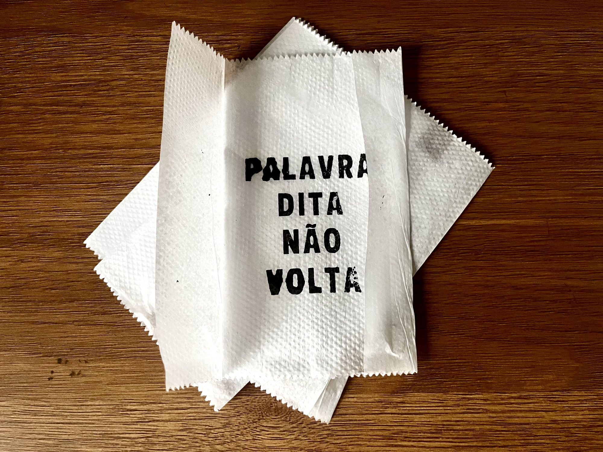 O público pode retirar os guardanapos e levá-los consigo, transformando o gesto cotidiano em experiência participativa e afetiva. O trabalho valoriza a tradição oral e propõe a circulação de saberes populares como forma de resistência, memória e reinvenção diante dos desafios da vida nas cidades.