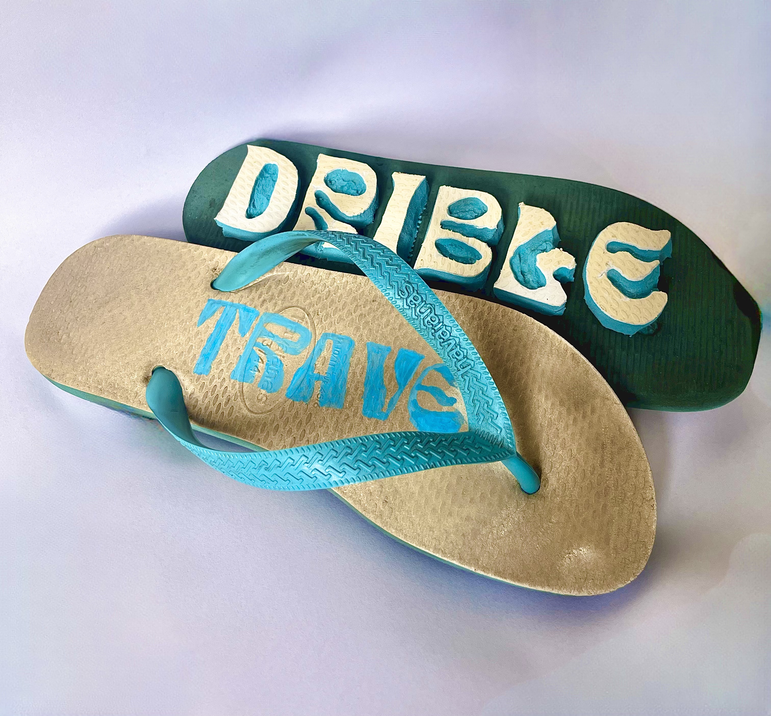 Um chinelo como elemento central, com as palavras “Trave” na parte superior e “Drible” na sola, busca simbolizar aspectos essenciais do futebol de rua: os chinelos usados como traves improvisadas, enquanto o drible representa a habilidade necessária no jogo da rua. Ao citar a cultura futebolística, em partidas informais de futebol jogadas em terrenos baldios, ruas ou qualquer espaço aberto disponível. As peladas são marcadas pela improvisação, criatividade e espírito comunitário, destacando como a paixão pelo futebol supera a falta de recursos materiais.
